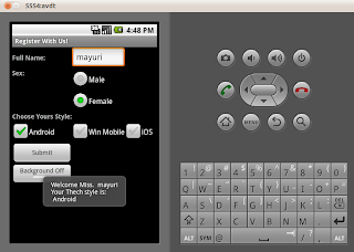 Here is another another simple example demonstrating Form elements in Android with its corresponding usage of Android API.